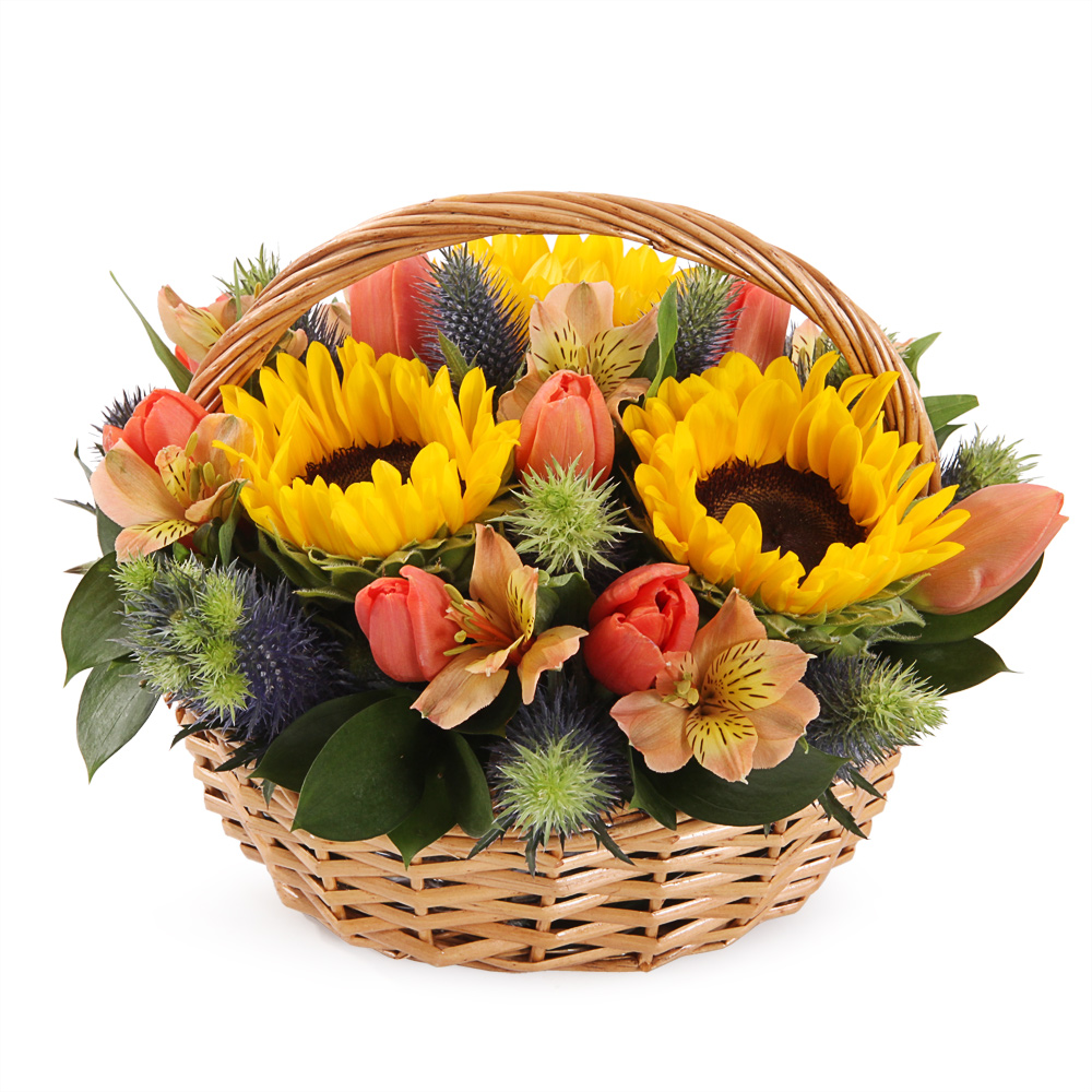Букет состоит из 3 подсолнуха, 9 тюльпанов, 1 альстромерия, 3 ветки эрингиума, зелень, корзина, оазис.