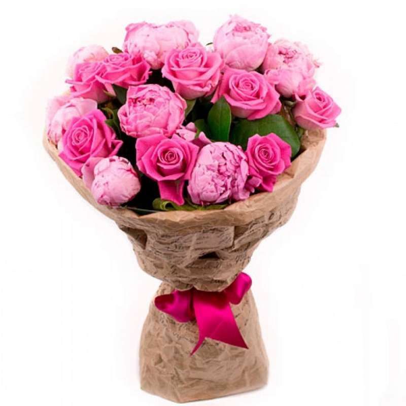 Букет состоит из 9 розовых роз, 8 пионов, зелень, крафт, атласная лента.