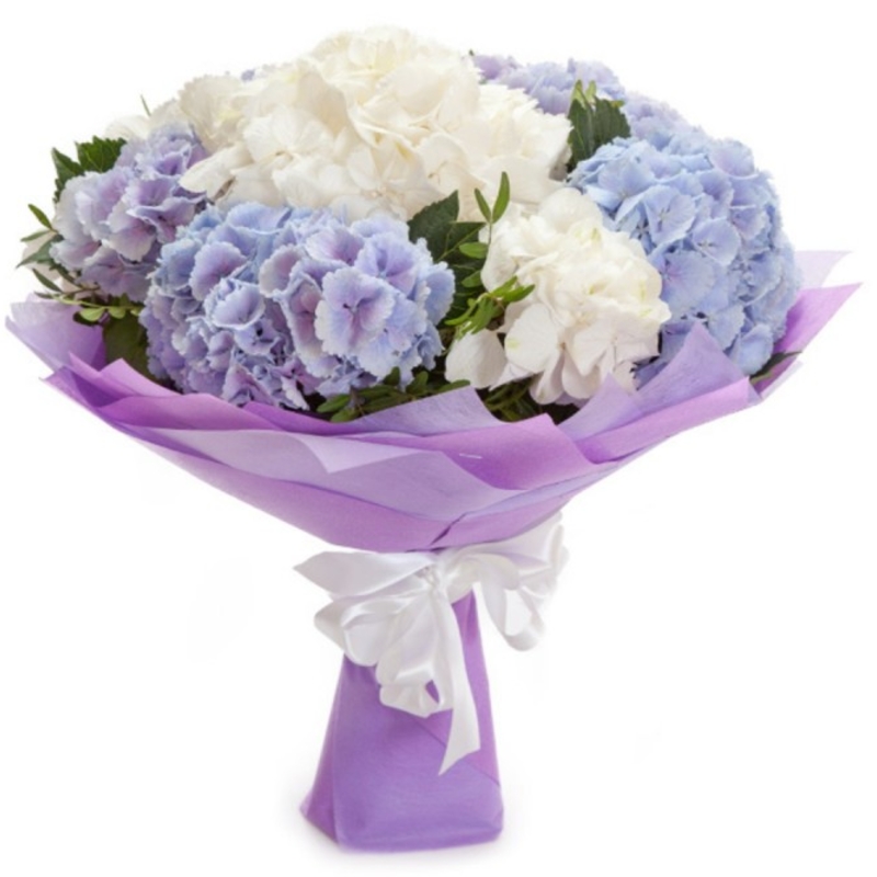 Букет состоит из 5 синих гортензий, 4 белые гортензии, зелень, красивая упаковка, атласная лента.